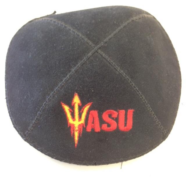 This black suede kippah is embroidered in red and yellow with the Arizona State University logo. This kippah makes a great gift for ASU students, teachers, alumni, and sports fans!