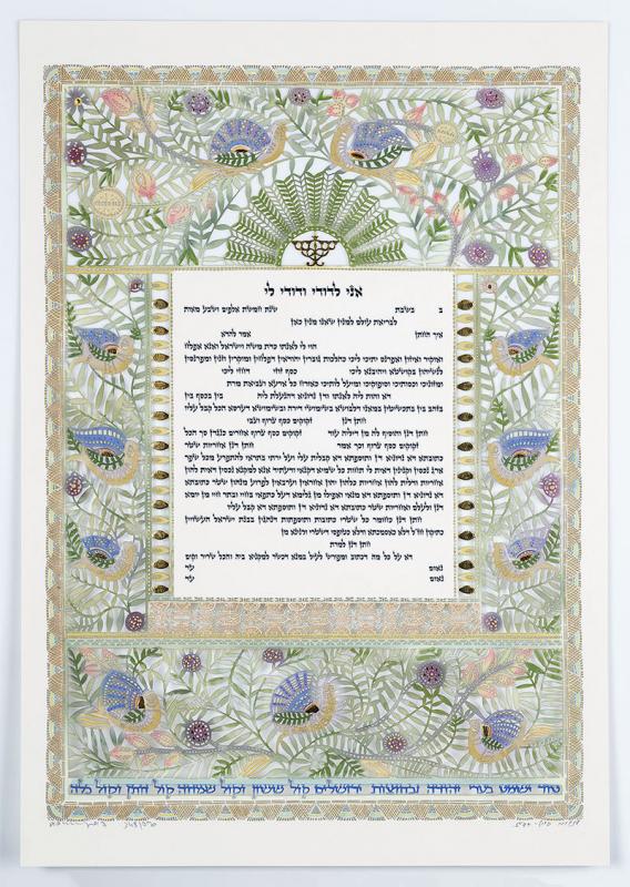 A gold menorah shines its light under a canopy of myrtle leaves (symbolic of the Jewish chuppah) while cheerful song birds proclaim the auspicious occasion. This lovely paper cut ketubah is full of birds and botany, color and movement, and bliss and delight.