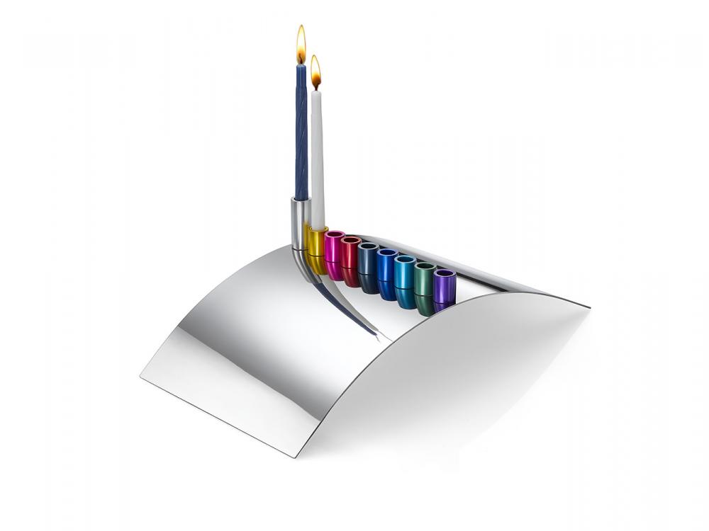 Laura designed this Hanukah menorah as a visual representation of the bridging of beliefs and understanding A bridge creates a means for people to meet. It connects the two banks of a river and metaphorically, two minds or two communities of people. By overcoming an obstacle you are creating a solution. The base is created out of gently formed highly polished steel. The colorful anodized aluminum candle holders are magnetic and can be placed wherever you wish on the metal base