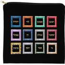 The Choshen Talit Bag displays the priestly breast plate with the 12 different stones embroidered in rainbow colors. The bag comes in navy or black and measures 14'' x 12.5''.