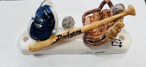 Show your appreciation for your favorite sports team with this Dodgers Mezuzah. The mezuzah is handcrafted and hand painted in Israel by Mordechai Hazan. A Dodgers bat, baseball, mitt, and Dodgers helmut rests on the surface of the mezuzah. Each mezuzah is signed by the artist and includes a photocopy scroll. Kosher scrolls can be purchased at an additional cost.