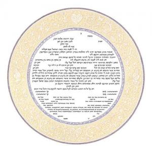 This elegant ketubah is decorated with buds and blossoms, harbingers of spring time, as well as butterflies and hearts, which represent love and marital bliss. The classic round design is symbolic of the love that exists between the new couple; as a circle symbolizes continuity,having no beginning or end, the new couple's love is forever. Written around the border are sayings from Songs of Songs and excerpts from the seven blessings recited under the chuppah. This ketubah is not only a stunningly adorned marriage contract, but a meaningful and special piece of art to treasure 'forever'. The text of the ketubah is hand calligraphed, continuing in the tradition of illuminated manuscripts,and the paper is archival and acid free.