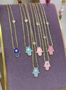 Complete the set with the matching gold-plated enamel Hamsa necklace for a coordinated look that honors tradition and modern elegance.
