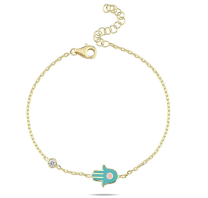 Celebrate protection, beauty, and intention with this Hamsa bracelet, plated in radiant gold and finished with rich enamel detail. The Hamsa hand — a timeless symbol of blessings, luck, and spiritual safeguarding — is accented with sparkling cubic zirconia stone that catches the light with every movement, adding a subtle, graceful sparkle.