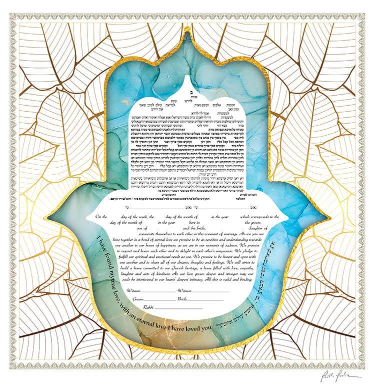A Hamsa is an ancient symbol which is thought to protect one from the "evil eye". This ketubah designed with soft colors of blue and gold, giving you the feel of tranquility and happiness.