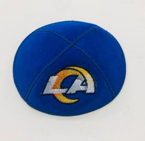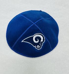 This royal blue suede kippah is embroidered in white and gold with the Rams logo. This kippah makes a great gift for any Rams fan!