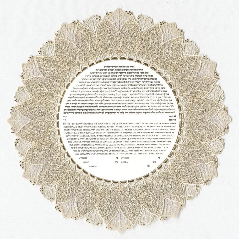 The beauty of this Ketubah lies, not only in its simplicity of composition coupled with the extreme delicacy of its detail, but also in the symbolism behind it. The circular composition represents unity and wholeness; while the layers of petals represent growth, beauty, and resilience. The use of the flower motif is also significant, as flowers symbolize love, beauty, and devotion.
