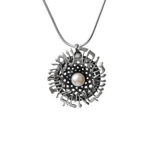 Shema pendant in sterling silver acts both as a necklace and pin. The Shema surrounds the pendant with a pearl in the middle. Shema Yisrael, ”Hear, O Israel: the Lord our God, the Lord is one,” found in Deuteronomy 6:4, is the most important prayer of the Jewish people.