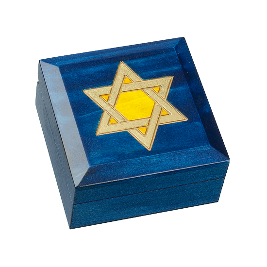 The Star of David Box is hand-painted with a metallic gold paint, seated on a deep rich Ultramarine Blue background.