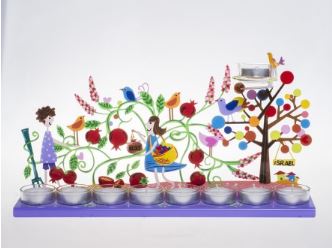 Made from brass and steel and shaped like a heart, this menorah is a great gift to give to someone you care about. This menorah has a triangle shaped piece of blue shades of blue glass on top of the heart.
