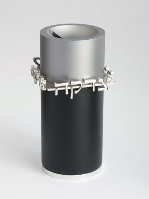 Modern Tzedakah box with the words Tzedaka written with different fonts.